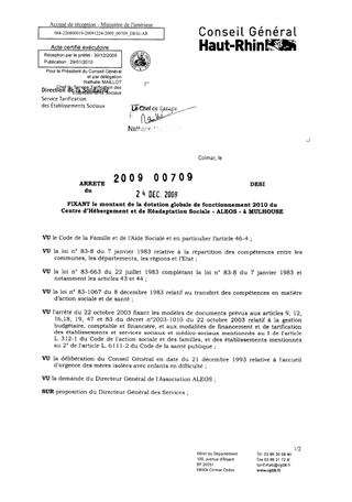 fixant le montant de la dotation globale de fonctionnement 2010 du centre d'hébergementet de réadaptation sociale "ALEOS" à MULHOUSE. Resumé Pièces jointes ARRETE Assemblée : Non défini Date : 24/12/2009 Rapporteur : Non défini Collectivité : Conseil départemental du Haut-Rhin Direction : Non défini Service : Direction de l'Autonomie Domaine : Dotations financières Commission :