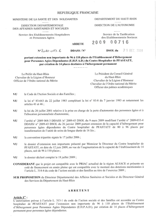 portant extension non importante de 96 à 110 places de l'établissement d'hébergement pour personnes âgées dépendantes (EHPAD) du centre hospitalier de PFASTATT, par création de 14 places destinées à l'hébergement permanent. Resumé Pièces jointes ARRETE Assemblée : Non défini Date : 29/12/2009 Rapporteur : Non défini Collectivité : Conseil départemental du Haut-Rhin Direction : Non défini Service : Direction de l'Autonomie Domaine : Autres (non classés) Commission :