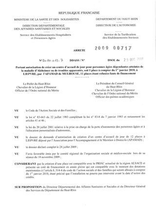 portant autorisation de créer un centre d'accueil de jour pour personnes âgées dépendantes atteintes de la maladie d'Alzheimer ou de troubles apparentés, soit 1 place à compter du 01.012010, à LIEPVRE, par l'APAMAD de MULHOUSE, 11 places étant refusées fa