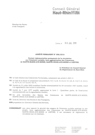 portant réglementation permanente de la circulation sur l'itinéraire cyclable, hors agglomération, des communes de SAINTE MARIE AUX MINES, SAINTE CROIX AUX MINES et LIEPVRE. Resumé Pièces jointes ARRETE Assemblée : Non défini Date : 08/01/2010 Rapporteur : Non défini Collectivité : Conseil départemental du Haut-Rhin Direction : Non défini Service : Direction des Routes Domaine : Circulation Commission :