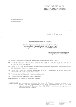 portant réglementation permanente de la circulation sur l'itinéraire cyclable situé le long de la RD 1 VII, hors agglomération, de la commune d'ALGOLSHEIM. Resumé Pièces jointes ARRETE Assemblée : Non défini Date : 08/01/2010 Rapporteur : Non défini Collectivité : Conseil départemental du Haut-Rhin Direction : Non défini Service : Direction des Routes Domaine : Circulation Commission :