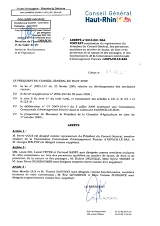 portant nomination du représentant du Président du Conseil Général, des personnes qualifiées en matière de faune, de flore et de protection de la nature et des paysages, et des fonctionnaires de la Com. Communale d'Aménagement Foncier d'ASPACH-LE-BAS.