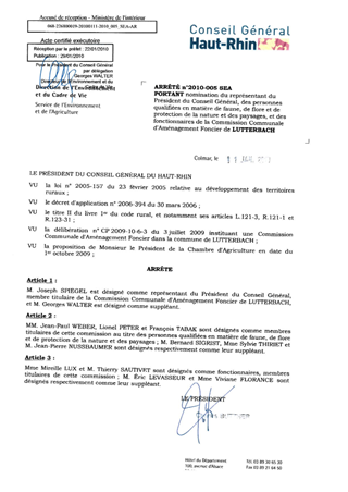 portant nomination du représentant du Président du Conseil Général, des personnes qualifiées en matière de faune, de flore et de protection de la nature et des paysages, et des fonctionnaires de la Com. Communale d'Aménagement Foncier de LUTTERBACH. Resumé Pièces jointes ARRETE Assemblée : Non défini Date : 11/01/2010 Rapporteur : Non défini Collectivité : Conseil départemental du Haut-Rhin Direction : Non défini Service : Direction de l'Environnement et du Cadre de Vie Domaine : Autres (non classés) Commission :