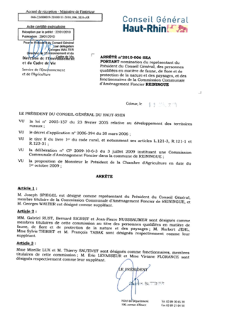 portant nomination du représentant du Président du Conseil Général, des personnes qualifiées en matière de faune, de flore et de protection de la nature et des paysages, et des fonctionnaires de la Com. Communale d'Aménagement Foncier de REININGUE. Resumé Pièces jointes ARRETE Assemblée : Non défini Date : 11/01/2010 Rapporteur : Non défini Collectivité : Conseil départemental du Haut-Rhin Direction : Non défini Service : Direction de l'Environnement et du Cadre de Vie Domaine : Autres (non classés) Commission :