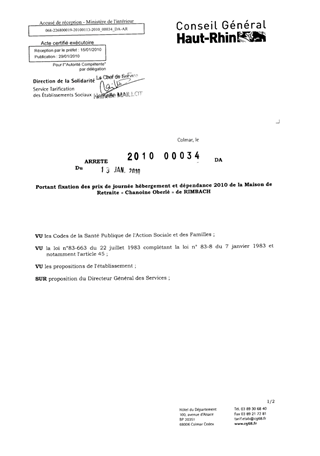 portant fixation des prix de journée hébergement et dépendance 2010 de la Maison de Retraite "Chanoine Oberlé" de RIMBACH. Resumé Pièces jointes ARRETE Assemblée : Non défini Date : 13/01/2010 Rapporteur : Non défini Collectivité : Conseil départemental du Haut-Rhin Direction : Non défini Service : Direction de l'Autonomie Domaine : Prix de Journée Commission :