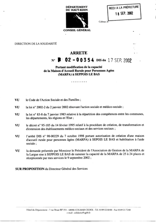Portant modification de la capacité de la Maison d'Accueil Rurale pour Personnes Agées (MARPA) à SEPPOIS LE BAS Resumé Pièces jointes ARRETE Assemblée : Non défini Date : 17/09/2002 Rapporteur : Non défini Collectivité : Conseil départemental du Haut-Rhin Direction : Non défini Service : Direction de la Solidarité Domaine : Personnes Agées Commission :