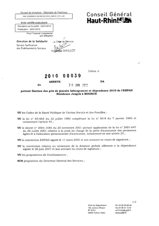 portant fixation des prix de journée hébergement et dépendance 2010 de l'EHPAD "Résidence Jungck à MOOSCH. Resumé Pièces jointes ARRETE Assemblée : Non défini Date : 20/01/2010 Rapporteur : Non défini Collectivité : Conseil départemental du Haut-Rhin Direction : Non défini Service : Direction de l'Autonomie Domaine : Prix de Journée Commission :