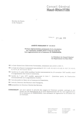 portant réglementation permanente de la circulation sur l'itinéraire cyclable situé le long de la RD 52, hors agglomération, de la commune de FESSENHEIM. Resumé Pièces jointes ARRETE Assemblée : Non défini Date : 25/01/2010 Rapporteur : Non défini Collectivité : Conseil départemental du Haut-Rhin Direction : Non défini Service : Direction des Routes Domaine : Circulation Commission :