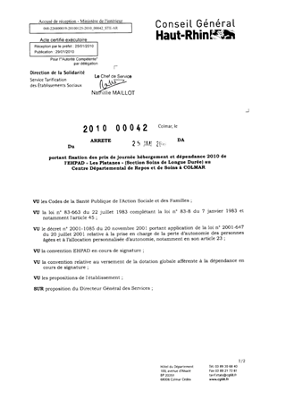 portant fixation des prix de journée hébergement et dépendance 2010 de l'EHPAD "Les Platanes" (section soins de longue durée) au centre départemental de repos et de soins à COLMAR. Resumé Pièces jointes ARRETE Assemblée : Non défini Date : 25/01/2010 Rapporteur : Non défini Collectivité : Conseil départemental du Haut-Rhin Direction : Non défini Service : Direction de l'Autonomie Domaine : Prix de Journée Commission :