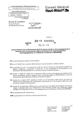 portant fixation des tarifs horaires 2010 du service d'aide et d'accompagnement à domicile pour les personnes adultes handicapées de l'association pour l'accompagnement et le maintien à domicile à MULHOUSE. Resumé Pièces jointes ARRETE Assemblée : Non défini Date : 29/01/2010 Rapporteur : Non défini Collectivité : Conseil départemental du Haut-Rhin Direction : Non défini Service : Direction de l'Autonomie Domaine : Autres (non classés) Commission :