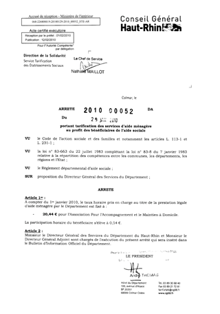 portant tarification des services d'aide ménagère au profit des bénéficiaires de l'aide sociale. Resumé Pièces jointes ARRETE Assemblée : Non défini Date : 29/01/2010 Rapporteur : Non défini Collectivité : Conseil départemental du Haut-Rhin Direction : Non défini Service : Direction de l'Autonomie Domaine : Autres (non classés) Commission :