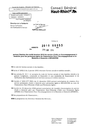 portant fixation des tarifs horaires 2010 du service d'aide et d'accompagnement à domicile pour les personnes âgées de l'association pour l'accompagnement et le maintien à domicile à MULHOUSE. Resumé Pièces jointes ARRETE Assemblée : Non défini Date : 29/01/2010 Rapporteur : Non défini Collectivité : Conseil départemental du Haut-Rhin Direction : Non défini Service : Direction de l'Autonomie Domaine : Autres (non classés) Commission :