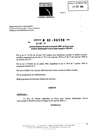 portant fixation du prix de journée 2002 au Foyer pour adultes handicapés graves Saint-Joseph à Thann Resumé Pièces jointes ARRETE Assemblée : Non défini Date : 19/09/2002 Rapporteur : Non défini Collectivité : Conseil départemental du Haut-Rhin Direction : Non défini Service : Direction Adjointe Personnes Agées et Personnes Handicapées Domaine : Prix de Journée Commission :