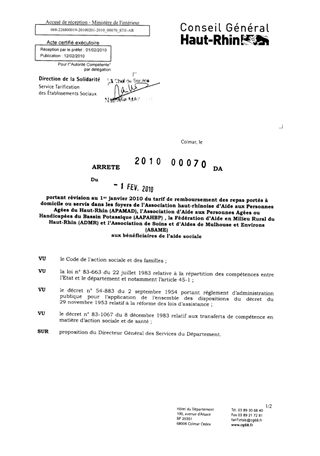 portant révision du 01.01.2010 du tarif de remboursement des repas portés à domicile ou servis dans les foyers de l'association haut-rhinoise d'aide aux personnes âgées du Haut-Rhin (APAMAD), l'association d'aide aux personnes âgées ou handicapées du Bass