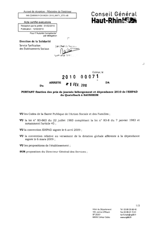 portant fixation des prix de journée hébergement et dépendance 2010 de l'EHPAD du Quatelbach à SAUSHEIM. Resumé Pièces jointes ARRETE Assemblée : Non défini Date : 01/02/2010 Rapporteur : Non défini Collectivité : Conseil départemental du Haut-Rhin Direction : Non défini Service : Direction de l'Autonomie Domaine : Prix de Journée Commission :