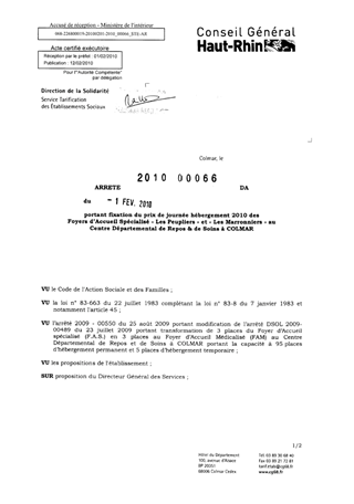 portant fixation du prix de journée hébergement 2010 des foyer d'accueil spécialisé "Les Peupliers" et "Les Marronniers" au centre départemental de repos et de soins à COLMAR. Resumé Pièces jointes ARRETE Assemblée : Non défini Date : 01/02/2010 Rapporteur : Non défini Collectivité : Conseil départemental du Haut-Rhin Direction : Non défini Service : Direction de l'Autonomie Domaine : Prix de Journée Commission :