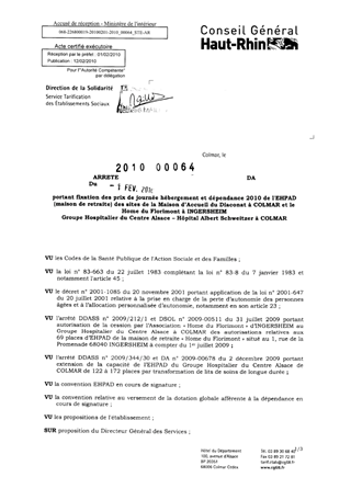 portant fixation des prix de journée hébergement et dépendance 2010 de l'EHPAD (maison de retraite) des sites de la maison d'accueil du Diaconat à COLMAR et le Home du Florimont à INGERSHEIM. Groupe hospitalier du Centre Alsace - Hôpital Albert Schweitzer