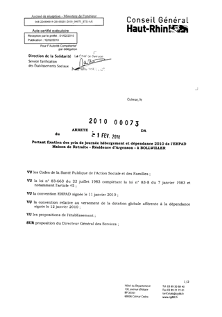 portant fixation des prix de journée hébergement et dépendance 2010 de l'EHPAD maison de retraite "Résidence d'Argenson" à BOLLWILLER. Resumé Pièces jointes ARRETE Assemblée : Non défini Date : 01/02/2010 Rapporteur : Non défini Collectivité : Conseil départemental du Haut-Rhin Direction : Non défini Service : Direction de l'Autonomie Domaine : Prix de Journée Commission :
