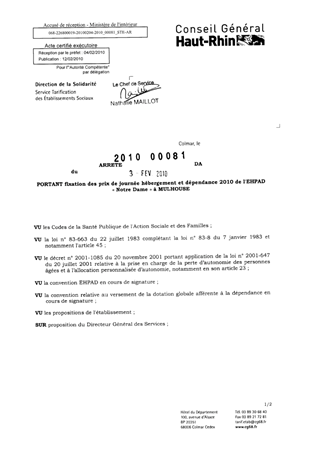 portant fixation des prix de journée hébergement et dépendance 2010 de l'EHPAD "Notre Dame" à MULHOUSE. Resumé Pièces jointes ARRETE Assemblée : Non défini Date : 03/02/2010 Rapporteur : Non défini Collectivité : Conseil départemental du Haut-Rhin Direction : Non défini Service : Direction de l'Autonomie Domaine : Prix de Journée Commission :