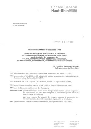 portant réglementation permanente de la circulation sur l'itinéraire cyclable situé sur le domaine public fluvial, sur le territoire des communes de COLMAR, HORBOURG-WIHR, HOLTZWIHR, BISCHWIHR, WICKERSCHWIHR, MUNTZENHEIM, DURRENENTZEN et ARTZENHEIM. Resumé Pièces jointes ARRETE Assemblée : Non défini Date : 03/02/2010 Rapporteur : Non défini Collectivité : Conseil départemental du Haut-Rhin Direction : Non défini Service : Direction des Routes Domaine : Circulation Commission :
