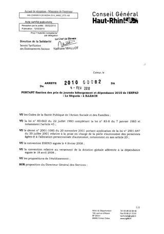 portant fixation des prix de journée hébergement et dépendance 2010 de l'EHPAD "Le Séquoia" à ILLZACH. Resumé Pièces jointes ARRETE Assemblée : Non défini Date : 04/02/2010 Rapporteur : Non défini Collectivité : Conseil départemental du Haut-Rhin Direction : Non défini Service : Direction de l'Autonomie Domaine : Prix de Journée Commission :