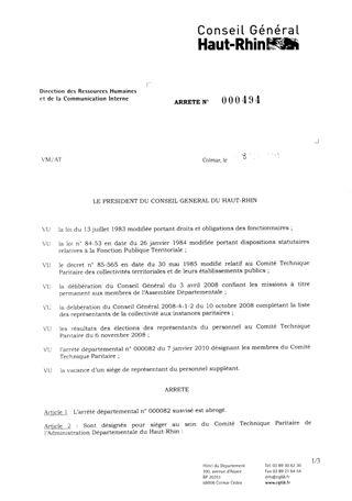 désignation au sein du Comité Technique Paritaire de l'Administration Départementale du Haut-Rhin. Resumé Pièces jointes ARRETE Assemblée : Non défini Date : 08/02/2010 Rapporteur : Non défini Collectivité : Conseil départemental du Haut-Rhin Direction : Non défini Service : Direction des Ressources Humaines et Dialogue Social Domaine : CTP, CHS, CAP Commission :