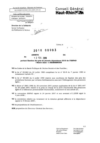 portant fixation des prix de journée dépendance 2010 de l'EHPAD "Sainte Anne" à HEIMSBRUNN. Resumé Pièces jointes ARRETE Assemblée : Non défini Date : 12/02/2010 Rapporteur : Non défini Collectivité : Conseil départemental du Haut-Rhin Direction : Non défini Service : Direction de l'Autonomie Domaine : Prix de Journée Commission :