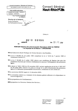 portant fixation des prix de journée dépendance 2010 de l'EHPAD "Le Doyenné de la Filature" à MULHOUSE. Resumé Pièces jointes ARRETE Assemblée : Non défini Date : 12/02/2010 Rapporteur : Non défini Collectivité : Conseil départemental du Haut-Rhin Direction : Non défini Service : Direction de l'Autonomie Domaine : Prix de Journée Commission :