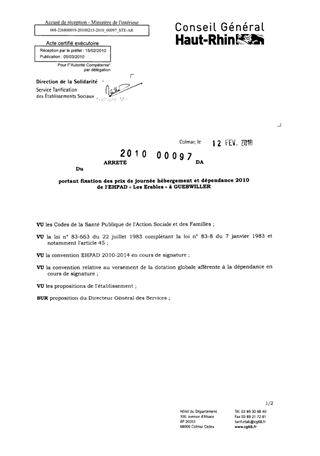 portant fixation des prix de journée hébergement et dépendance 2010 de l'EHPAD "Les Erables" à GUEBWILLER. Resumé Pièces jointes ARRETE Assemblée : Non défini Date : 12/02/2010 Rapporteur : Non défini Collectivité : Conseil départemental du Haut-Rhin Direction : Non défini Service : Direction de l'Autonomie Domaine : Prix de Journée Commission :