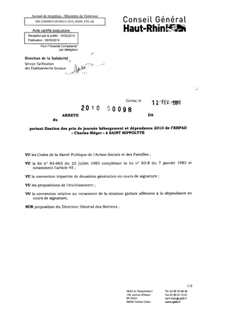 portant fixation des prix de journée hébergement et dépendance 2010 de l'EHPAD "Charles Bléger" à SAINT HIPPOLYTE. Resumé Pièces jointes ARRETE Assemblée : Non défini Date : 12/02/2010 Rapporteur : Non défini Collectivité : Conseil départemental du Haut-Rhin Direction : Non défini Service : Direction de l'Autonomie Domaine : Prix de Journée Commission :
