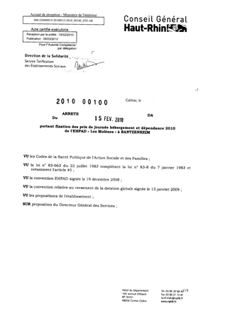 portant fixation des prix de journée hébergement et dépendance 2010 de l'EHPAD "Les Molènes" à BANTZENHEIM. Resumé Pièces jointes ARRETE Assemblée : Non défini Date : 15/02/2010 Rapporteur : Non défini Collectivité : Conseil départemental du Haut-Rhin Direction : Non défini Service : Direction de l'Autonomie Domaine : Prix de Journée Commission :