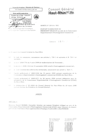 portant nomination du Président Délégué au sein de la commission départementale d'aménagement commercial. Resumé Pièces jointes ARRETE Assemblée : Non défini Date : 15/02/2010 Rapporteur : Non défini Collectivité : Conseil départemental du Haut-Rhin Direction : Non défini Service : Service Développement Economique Domaine : Autres (non classés) Commission :