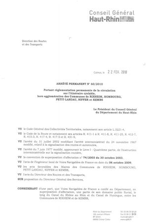 portant réglementation permanente de la circulation sur l'itinéraire cyclable, hors agglomération des communes de RIXHEIM, HOMBOURG, PETIT-LANDAU, NIFFER et KEMBS. Resumé Pièces jointes ARRETE Assemblée : Non défini Date : 22/02/2010 Rapporteur : Non défini Collectivité : Conseil départemental du Haut-Rhin Direction : Non défini Service : Direction des Routes Domaine : Circulation Commission :