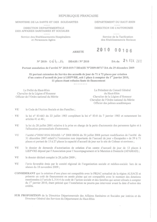 portant annulation de l'arrêté n°2010-019-7-DDASS/n°2009-00717-DA du 29.12.2009 et portant extension du service des accueils de jour de 71 à 72 places par création d'un centre d'accueil de jour à LIEPVRE, soi 1 place à compter du 1er.01.2010 Resumé Pièces jointes ARRETE Assemblée : Non défini Date : 24/02/2010 Rapporteur : Non défini Collectivité : Conseil départemental du Haut-Rhin Direction : Non défini Service : Direction de l'Autonomie Domaine : Autres (non classés) Commission :