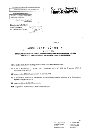 portant fixation des prix de journée hébergement et dépendance 2010 de l'EHPAD de l'établissement du Docteur Thuet de ENSISHEIM. Resumé Pièces jointes ARRETE Assemblée : Non défini Date : 24/02/2010 Rapporteur : Non défini Collectivité : Conseil départemental du Haut-Rhin Direction : Non défini Service : Direction de l'Autonomie Domaine : Prix de Journée Commission :