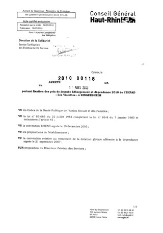 portant fixation des prix de journée hébergement et dépendance 2010 de l'EHPAD "Les Violettes" à KINGERSHEIM. Resumé Pièces jointes ARRETE Assemblée : Non défini Date : 01/03/2010 Rapporteur : Non défini Collectivité : Conseil départemental du Haut-Rhin Direction : Non défini Service : Direction de l'Autonomie Domaine : Prix de Journée Commission :