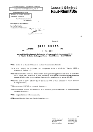 portant fixation des prix de journée hébergement et dépendance 2010 de l'unité de soins de longue durée "Saint Morand" à ALTKIRCH. Resumé Pièces jointes ARRETE Assemblée : Non défini Date : 01/03/2010 Rapporteur : Non défini Collectivité : Conseil départemental du Haut-Rhin Direction : Non défini Service : Direction de l'Autonomie Domaine : Prix de Journée Commission :