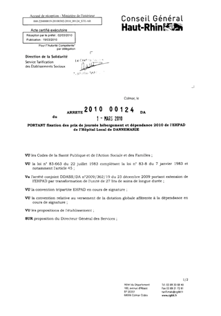 portant fixation des prix de journée hébergement et dépendance 2010 de l'EHPAD de l'hôpital local de DANNEMARIE. Resumé Pièces jointes ARRETE Assemblée : Non défini Date : 01/03/2010 Rapporteur : Non défini Collectivité : Conseil départemental du Haut-Rhin Direction : Non défini Service : Direction de l'Autonomie Domaine : Prix de Journée Commission :