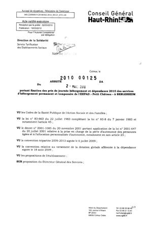 portant fixation des prix de journée hébergement et dépendance 2010 des services d'hébergement permanent et temporaire de l'EHPAD "Petit Château" à BEBLENHEIM. Resumé Pièces jointes ARRETE Assemblée : Non défini Date : 02/03/2010 Rapporteur : Non défini Collectivité : Conseil départemental du Haut-Rhin Direction : Non défini Service : Direction de l'Autonomie Domaine : Prix de Journée Commission :