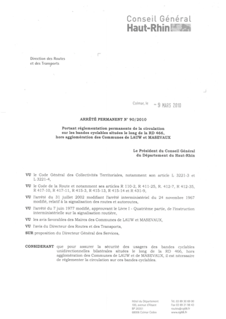 portant réglementation permanente de la circulation sur les bandes cyclables situées le long de la RD 466, hors agglomération, des communes de LAUW et MASEVAUX. Resumé Pièces jointes ARRETE Assemblée : Non défini Date : 09/03/2010 Rapporteur : Non défini Collectivité : Conseil départemental du Haut-Rhin Direction : Non défini Service : Direction des Routes Domaine : Circulation Commission :