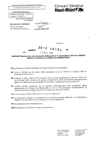 portant fixation des prix de journée hébergement et dépendance 2010 de l'EHPAD Maison de Retraite de l'hôpital de RIBEAUVILLE. Resumé Pièces jointes ARRETE Assemblée : Non défini Date : 10/03/2010 Rapporteur : Non défini Collectivité : Conseil départemental du Haut-Rhin Direction : Non défini Service : Direction de l'Autonomie Domaine : Prix de Journée Commission :