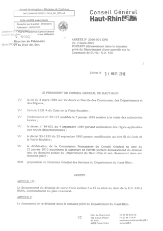 portant déclassement dans le domaine privé du Département d'une parcelle sur la commune de BUHL - R.D. 430. Resumé Pièces jointes ARRETE Assemblée : Non défini Date : 11/03/2010 Rapporteur : Non défini Collectivité : Conseil départemental du Haut-Rhin Direction : Non défini Service : Service du Patrimoine et du droit des Sols Domaine : Déclassement de voirie Commission :