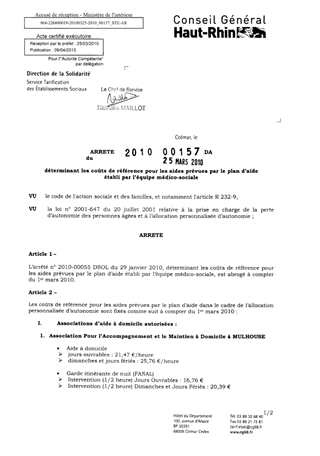 déterminant les coûts de référence pour les aides prévues par le plan d'aide établi par l'équipe médico-sociale. Resumé Pièces jointes ARRETE Assemblée : Non défini Date : 25/03/2010 Rapporteur : Non défini Collectivité : Conseil départemental du Haut-Rhin Direction : Non défini Service : Direction de l'Autonomie Domaine : Autres (non classés) Commission :