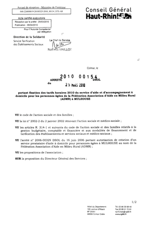 portant fixation des tarifs horaires 2010 du service d'aide et d'accompagnement à domicile pour les personnes âgées de la Fédération Association d'Aide en Milieu Rural (ADMR) à MULHOUSE. Resumé Pièces jointes ARRETE Assemblée : Non défini Date : 25/03/2010 Rapporteur : Non défini Collectivité : Conseil départemental du Haut-Rhin Direction : Non défini Service : Direction de l'Autonomie Domaine : Autres (non classés) Commission :