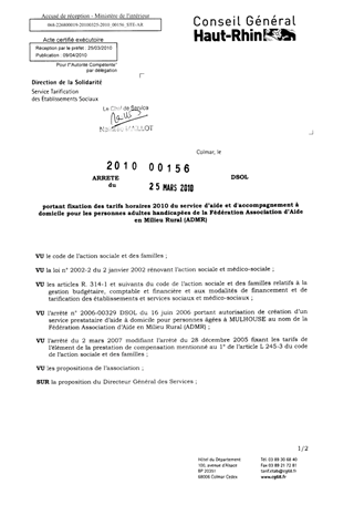 portant fixation des tarifs horaires 2010 du service d'aide et d'accompagnement à domicile pour les personnes adultes handicapées de la Fédération Association d'Aide en Milieu Rural (ADMR). Resumé Pièces jointes ARRETE Assemblée : Non défini Date : 25/03/2010 Rapporteur : Non défini Collectivité : Conseil départemental du Haut-Rhin Direction : Non défini Service : Direction de l'Autonomie Domaine : Autres (non classés) Commission :