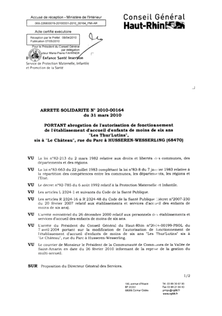 portant abrogation de l'autorisation de fonctionnement de l'établissement d'accueil d'enfants de moins de six ans "Les Thur'Lutins", sis à "Le Château", rue du Parc à HUSSEREN-WESSERLING (68470). Resumé Pièces jointes ARRETE Assemblée : Non défini Date : 31/03/2010 Rapporteur : Non défini Collectivité : Conseil départemental du Haut-Rhin Direction : Non défini Service : Direction Enfance Santé Insertion Domaine : Accueil d'enfants Commission :