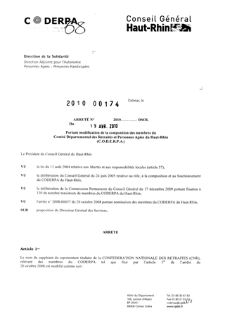 portant modification de la composition des membres du Comité Départemental des Retraités et Personnes Agées du Haut-Rhin (C.O.D.E.R.P.A.). Resumé Pièces jointes ARRETE Assemblée : Non défini Date : 19/04/2010 Rapporteur : Non défini Collectivité : Conseil départemental du Haut-Rhin Direction : Non défini Service : Direction de l'Autonomie Domaine : Autres (non classés) Commission :