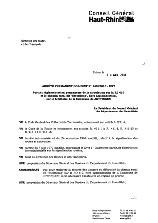 portant réglementation permanente de la circulation sur la RD 419 et le chemin rural dit "Stettelweg", hors agglomération, sur le territoire de la commune de JETTINGEN. Resumé Pièces jointes ARRETE Assemblée : Non défini Date : 20/04/2010 Rapporteur : Non défini Collectivité : Conseil départemental du Haut-Rhin Direction : Non défini Service : Direction des Routes Domaine : Circulation Commission :