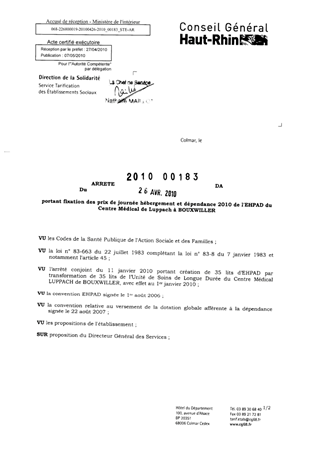 portant fixation des prix de journée hébergement et dépendance 2010 de l'EHPAD du centre médical de Luppach à BOUXWILLER. Resumé Pièces jointes ARRETE Assemblée : Non défini Date : 26/04/2010 Rapporteur : Non défini Collectivité : Conseil départemental du Haut-Rhin Direction : Non défini Service : Direction de l'Autonomie Domaine : Autres (non classés) Commission :