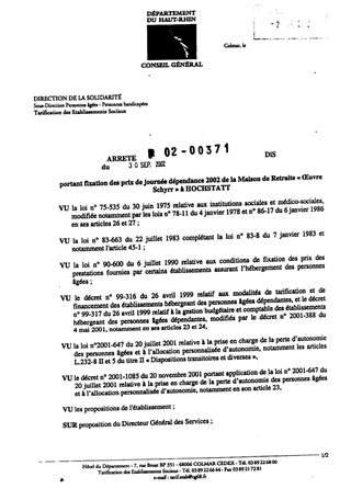 portant fixation des prix de journée dépendance 2002 de la Maison de Retraite "Oeuvre Schyrr" à HOCHSTATT. Resumé Pièces jointes ARRETE Assemblée : Non défini Date : 30/09/2002 Rapporteur : Non défini Collectivité : Conseil départemental du Haut-Rhin Direction : Non défini Service : Direction Adjointe Personnes Agées et Personnes Handicapées Domaine : Prix de Journée Commission :